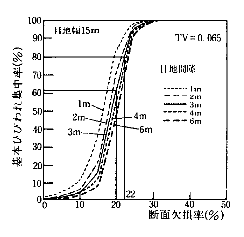 目地間隔3m以下の場合、ひび割れ集中率を70〜80%以上にするには断面欠損率20〜25%以上が必要だと判ります。